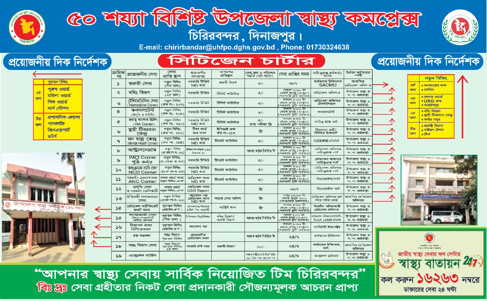 | ৩ | জরম্নরী বিভাগে চিকিৎসা কার্যত্রম মোবাইল ফোনে জরুরী স্বাস্থ্য পরামর্শ। মোবাঃ নং-০১৭৩০৩২৪৬৩৮ | সার্বক্ষনিক সার্বক্ষনিক | আবাসিক মেডিকেল অফিসার মেডিকেল অফিসার মেডিকেল এ্যাসিসটেন্ট |